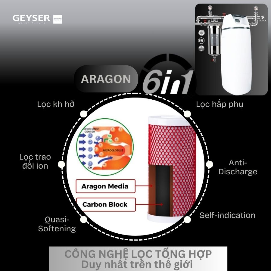 Aragon là công nghệ lọc nổi tiếng gần 40 năm qua của Geyser – Được coi là trái tim của trong hầu hết các bộ lọc nước của Geyser, đã được cấp bằng phát minh sáng chế. Aragon là công nghệ lọc nước tổng hợp duy nhất trên thế giới được phát triển tại LB Nga từ thập niên 80 và được ứng dụng hiệu quả trong xử lý nước nhiễm xạ tại Chernobyl, ưu thế của Aragon là công nghệ lọc này có thể customize theo từng nguồn nước, mục đích sử dụng khác nhau nhằm mang lại hiệu quả xử lý nước tốt nhất, việc ứng dụng Aragon trong hệ thống lọc nước tổng Geyser Ecotar 1F10S mang lại hiệu quả đặc biệt trong xử lý nước: