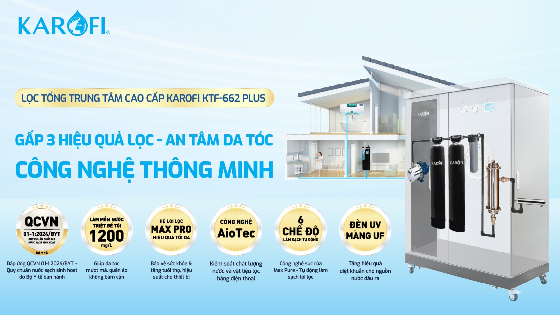 Máy lọc tổng trung tâm cao cấp Karofi KTF-662 Plus là giải pháp toàn diện cho nhà phố và biệt thự, với khả năng lọc sạch gấp 3 lần, loại bỏ tối đa tạp chất, kim loại nặng và cặn bẩn từ nguồn nước đầu vào. Sản phẩm không chỉ cung cấp nguồn nước an toàn cho cả gia đình mà còn nâng niu làn da, mái tóc trước tác động của nước cứng. Đồng thời, KTF-662 Plus đóng vai trò như một “lá chắn” bền vững, bảo vệ các thiết bị gia dụng cao cấp trong nhà luôn sáng bóng và bền đẹp theo thời gian.