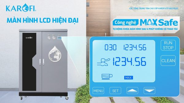 Karofi KTF-662 Plus được trang bị màn hình LCD hiện đại, hiển thị các thông tin về khối lượng nước thành phẩm, lưu lượng nước đang lọc, thời điểm sục rửa, hoàn nguyên trong ngày cùng 6 chế độ vận hành của máy. Tính năng thông minh MAX SAFE tự động tắt màn hình khi không có thao tác sử dụng trong vòng 4 phút bảo vệ màn hình, tránh những thao tác nhầm không mong muốn.