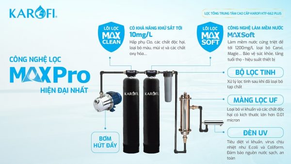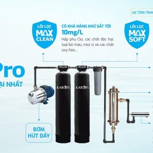 - Hệ cột lọc MAX PRO: bao gồm cột lọc MaxClean than hoạt tính và cột làm mềm MAX SOFT xử lý hiệu quả các vấn đề của nguồn nước sinh hoạt